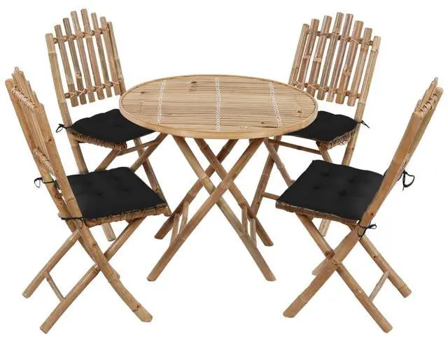 This 5 Piece Folding Patio Dining Set mixes stylish design with tough materials, making it a great pick for both indoor and outdoor use. Made with natural bamboo and soft polyester cushions, the set adds rustic charm to your terrace or balcony while ensuring comfort for up to four people.
