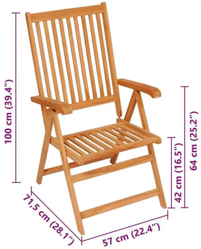 The folding and reclining wooden chair has a classic design. Constructed from extremely durable teak hard wood, this piece of teak furniture has been seasoned, kiln dried and then fine sanded to give a very smooth appearance. Teak wood is known for its exceptional strength and weather resistance, making it far more suitable for garden furniture than any other kind of wood. Teak wood is the perfect choice if you want to purchase a long lasting piece of garden furniture. The armchair's backrest can be adjusted in 7 reclining settings, so you can always find the most comfortable position.