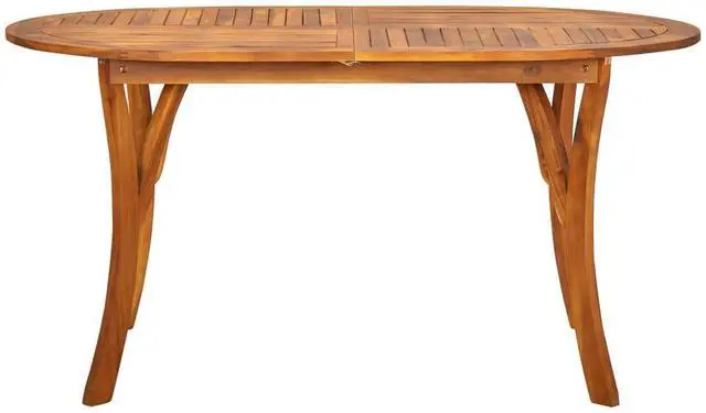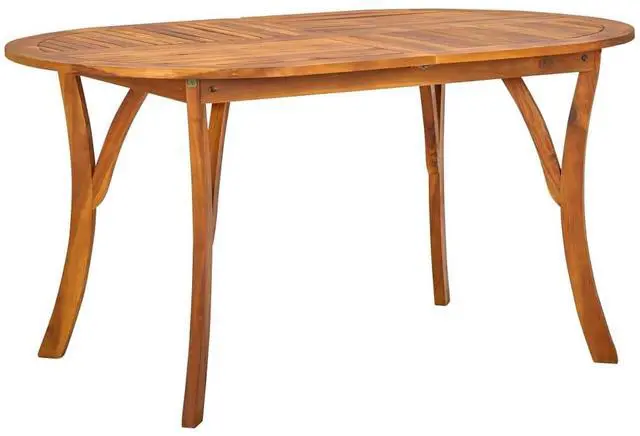 This dining table made from solid Acacia wood has a beautiful oil finish that highlights the grain while being tough against outdoor elements.