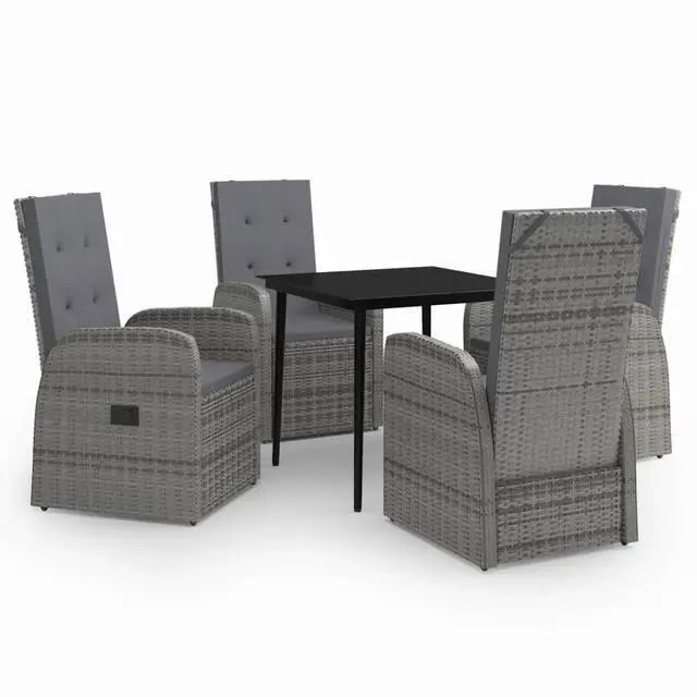 This 5-Piece Garden Dining Set is the perfect blend of style and practicality for your outdoor space, whether youre having a quiet meal or a big get-together. With its chic grey and black rattan and comfy polyester cushions, this set makes your patio or garden feel welcoming, ideal for dining, entertaining, or just kicking back.