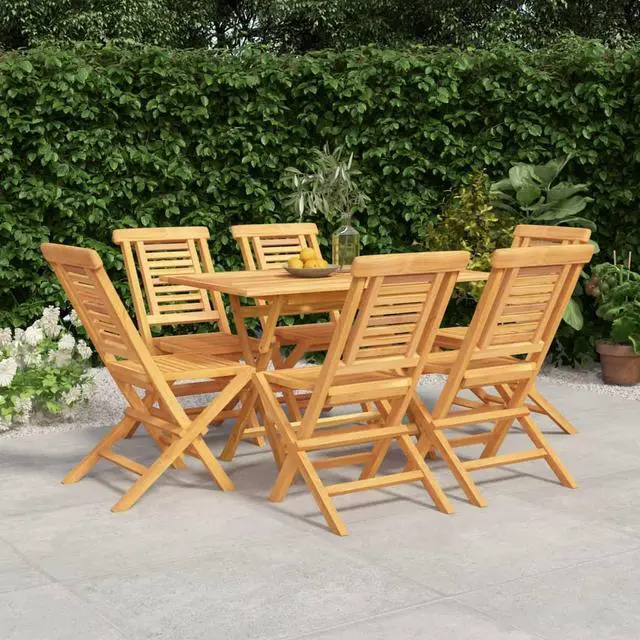 This 7-piece outdoor dining set is a fab choice for alfresco gatherings. It has a beautifully crafted rectangular table and six foldable chairs, all made from solid teak wood. The warm teak tones will suit any outdoor setting, whether you're on a cozy balcony or a spacious patioperfect for family meals, barbecues, or casual get-togethers with friends.