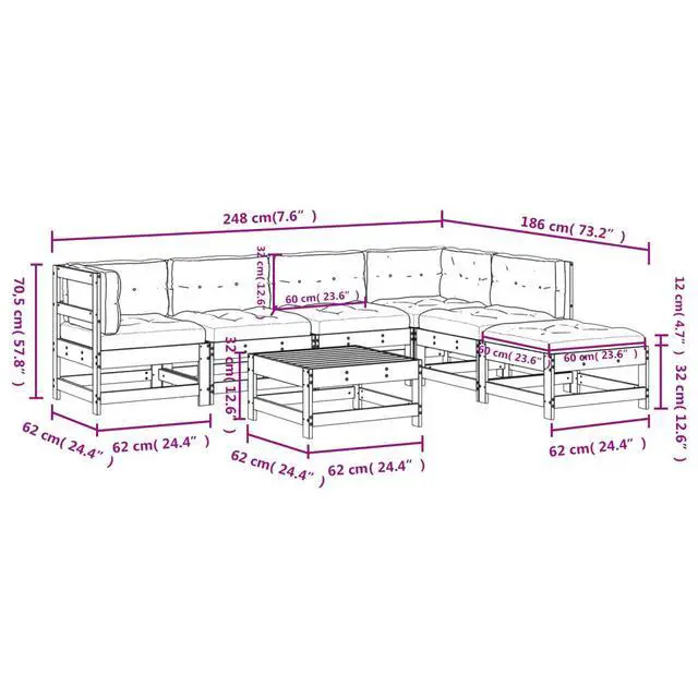 This 7-Piece Garden Lounge Set blends rustic charm with modern use, made from solid pine wood and plywood. Perfect for outdoor get-togethers, it includes three middle sofas, two corner sofas, and two footstools/coffee tables, giving comfort and style for family and friends to enjoy in a garden, balcony, or patio.