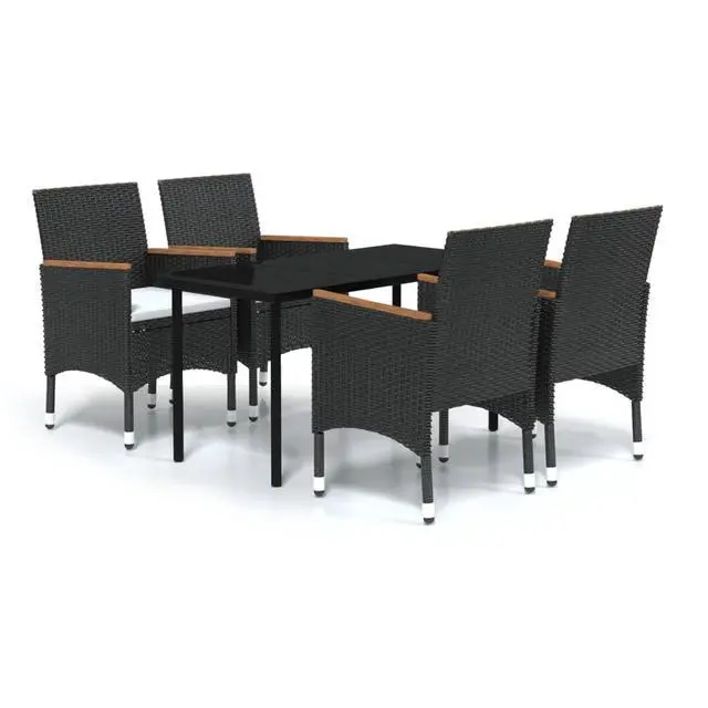 This 5-Piece Outdoor Dining Set is a smart and comfy option for outdoor dining and chilling out. It includes a rectangular table and four chairs, all in a sleek black finish with weather-resistant PE rattan seating, making it perfect for any garden, patio, or balcony where you want to relax or host gatherings with family and mates.