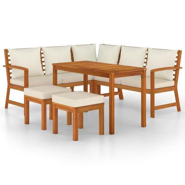 This 6 Piece Garden Dining Set brings elegance and practicality to your outdoor dining. Made from solid acacia wood with a luxe oil finish, its got a retro charm that fits any garden or patio, making it a go-to for meals or just chilling out. The natural wood colors give off chill outdoor vibes, highlighting the beauty of nature while giving you a solid and dependable dining option.