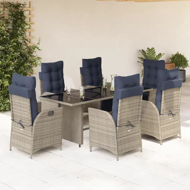 This 7-Piece Garden Dining Set is your ideal outdoor buddy, mixing style and practicality. It's got a sleek rectangular table and six reclining chairs, all designed for top-notch comfort during your meals. The trendy grey shade and woven poly rattan texture give off a stylish vibe that fits right in with your outdoor setup, ensuring you and your friends have a pleasant dining experience.