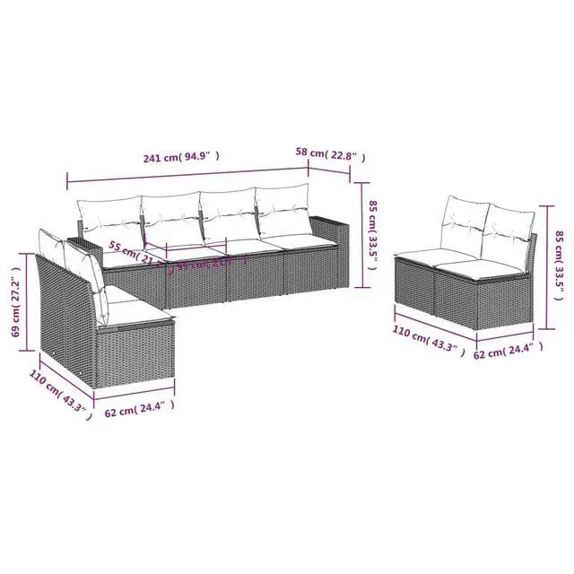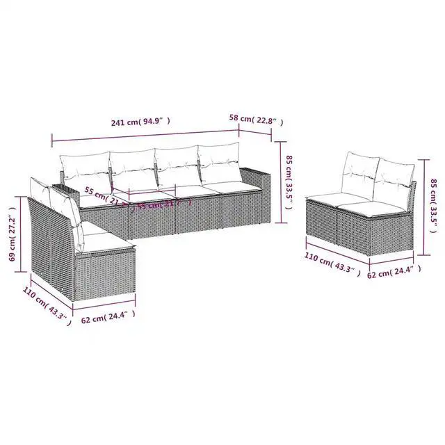 Delivery Contains: 2 Corner seats, 6 Center seats, 8 Back cushions, 8 Seat cushions