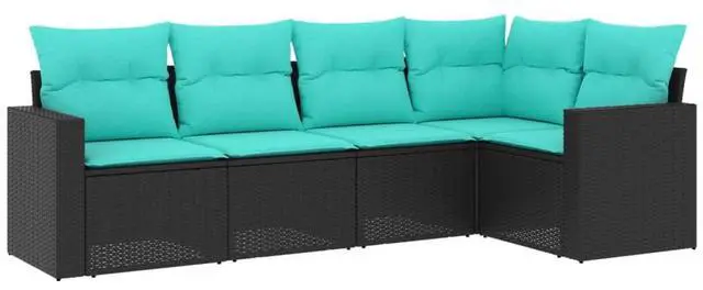 This 5-piece modular garden sofa set radiates a modern vibe while being the perfect spot to chill outside. With its classy but comfy texture, it mixes black poly rattan with lively blue cushions for a friendly feel, making it ideal for get-togethers or quiet moments in your backyard or terrace.