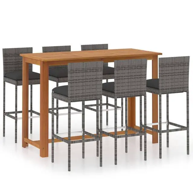 This 7 piece garden bar set brings both elegance and functionality to your outdoor gatherings, blending contemporary style with practical use. It's built from solid acacia wood and poly rattan, creating a welcoming space for friends and family to chill out while enjoying good food or drinks in your garden, patio, or terrace.