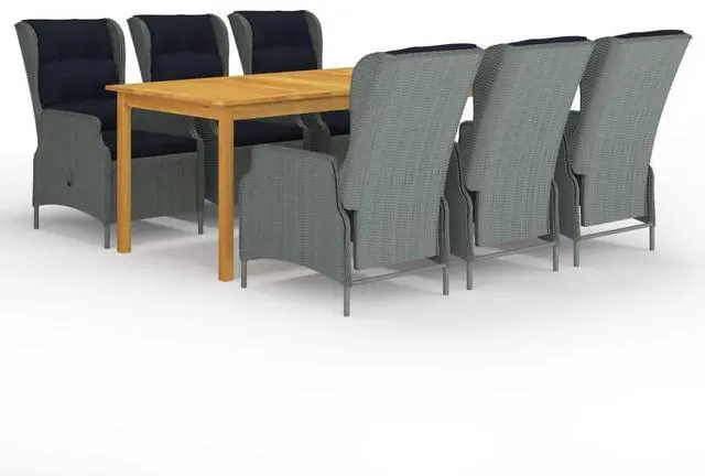 This 7-piece outdoor dining set combines style and function, perfect for get-togethers in your garden or on your terrace. Featuring a sleek design in light grey synthetic rattan and solid acacia wood, this dining set not only lifts your outdoor aesthetics but also ensures a comfortable dining experience for up to six people, creating unforgettable moments with family and friends while enjoying the lovely outdoors.