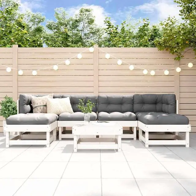 This 7-Piece Garden Lounge Set boasts a sleek rustic style thats perfect for sprucing up your outdoor space. Crafted from solid pine wood with a clean white finish, it includes two middle sofas, two corner sofas, and three handy garden footstools or coffee tables for a stylish setup thats ideal for relaxing or entertaining.