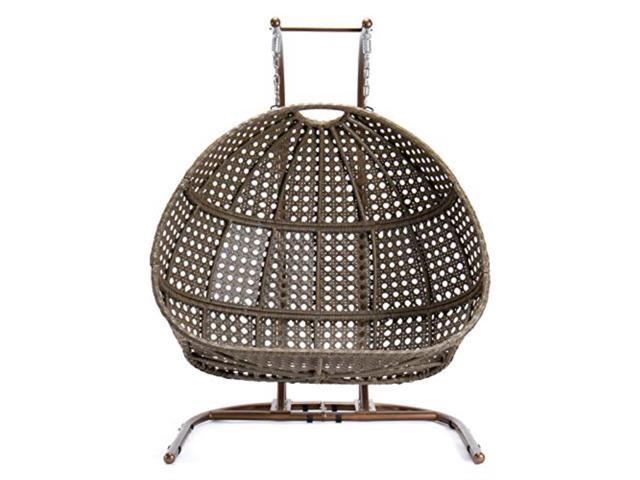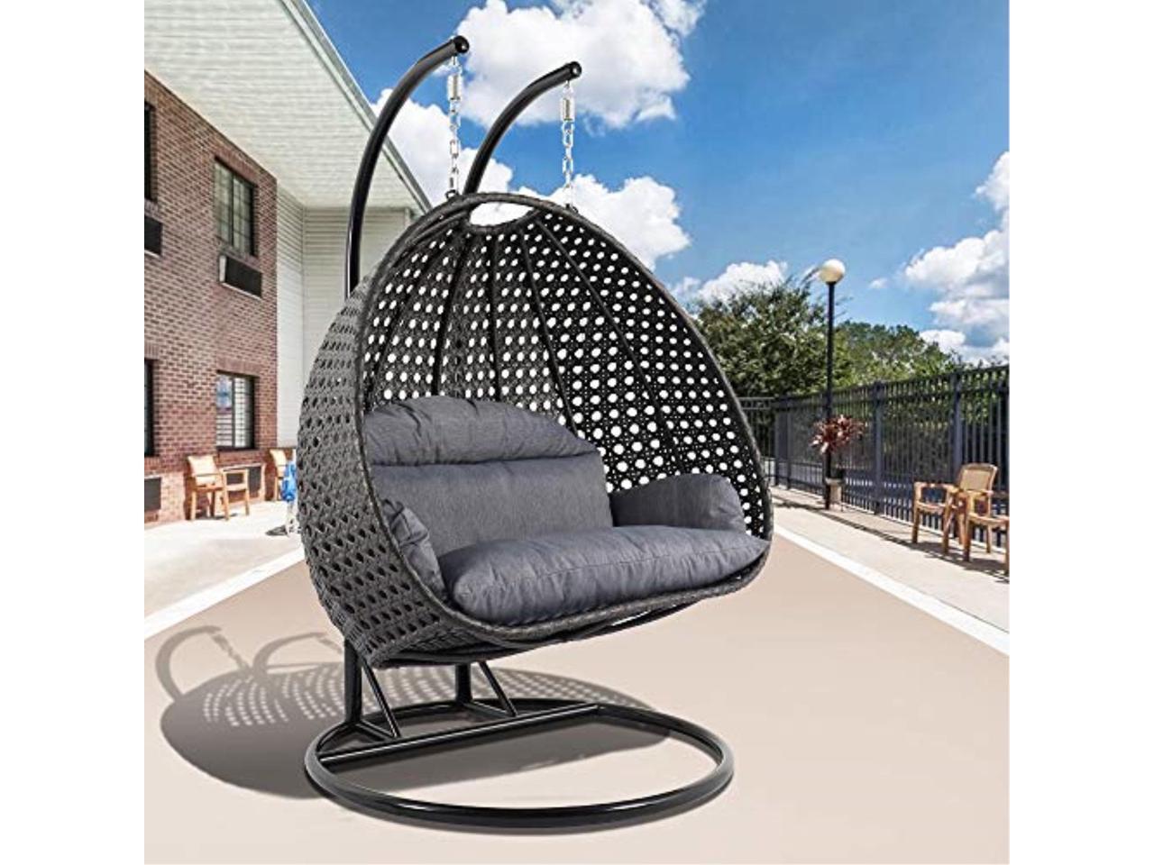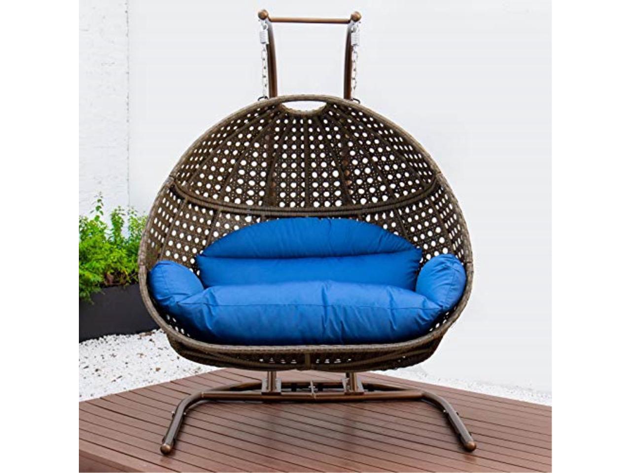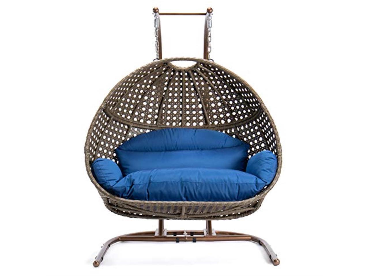 LeisureMod Wicker 2 Person Hanging Egg Swing Chair With Cushion Indoor Outdoor Use in Charcoal Blue