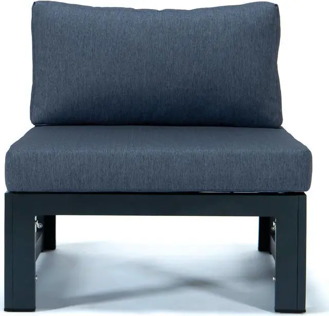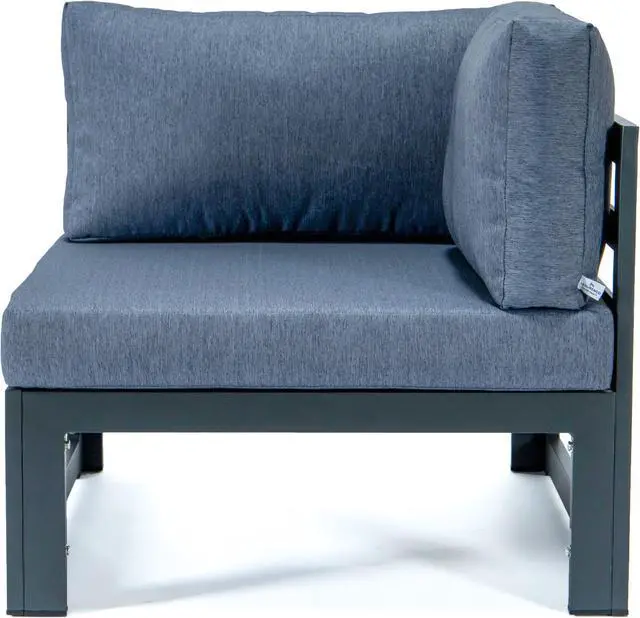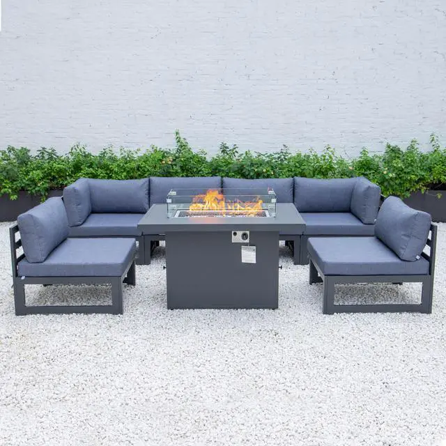 LeisureMod Chelsea 7-Piece Modern Outdoor Patio Sectional Sofa Set With Propane Fire Pit Table with Black Aluminum Frame and Removable Cushions in Blue