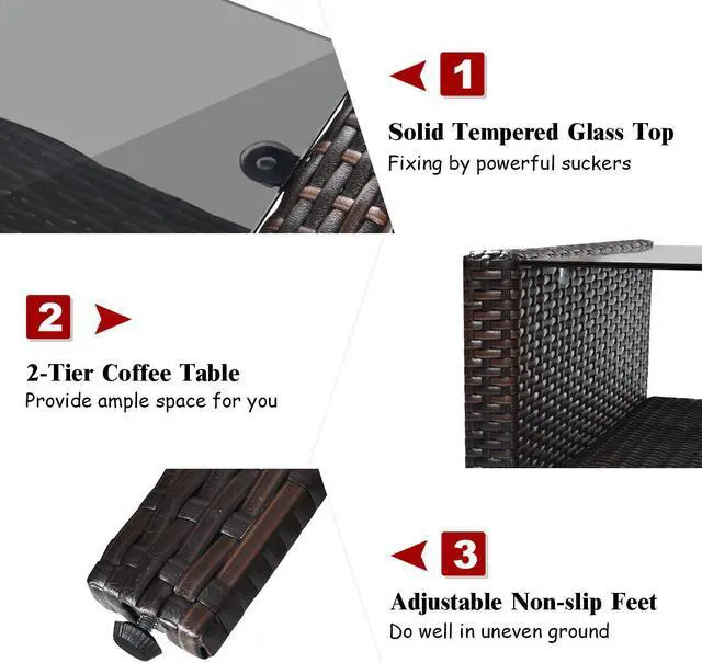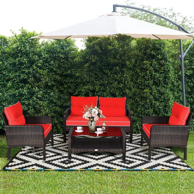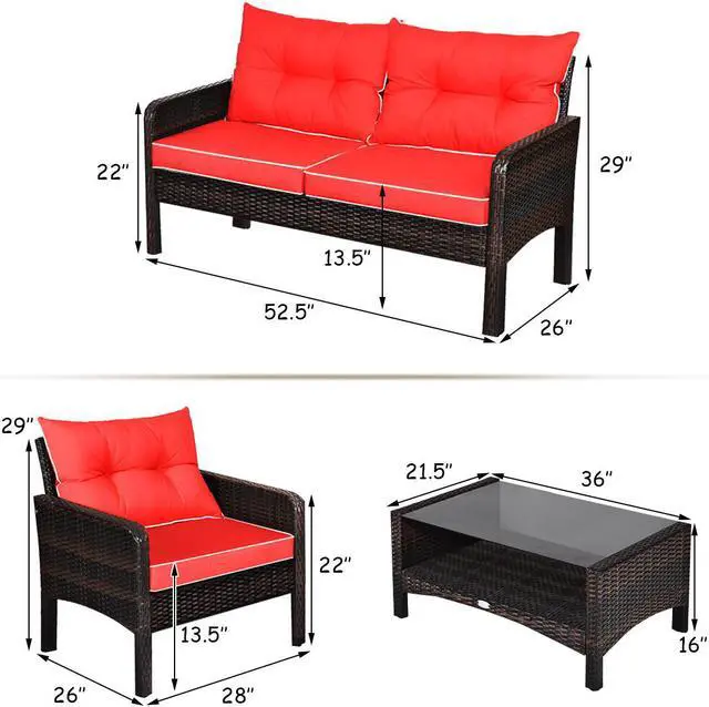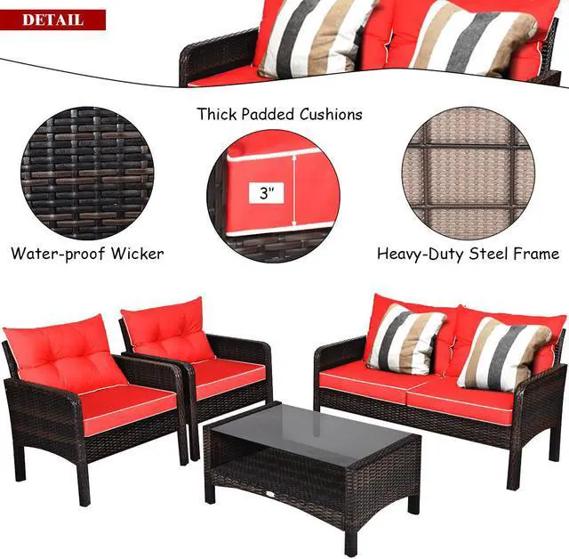 Our 4 piece rattan furniture includes one bench, two single sofas and a coffee table, which can free combination according to your need and base on your room space. Made of premium steel and wicker, it is sturdy and sturdy for worry-free using. In addition to high-quality materials, this patio furniture set has well craftsmanship and excellent load bearing as well. What's more, seat cushions and back cushions are prepared for maximum comfort and excellent seating experience. In order for easy cleaning, the cover of seat cushion with built-in zipper is removable and washable. It is worth mentioning that the practical coffee table has not only a sturdy tempered glass table top, but also 2 large storage spaces. This modern and stylish patio furniture set is great for courtyard, balcony and poolside to enjoy leisure time.