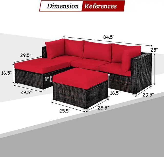 Enjoy your outdoor leisure time with this 5-piece rattan sectional seating group! Our 5pcs rattan sofa set includes 2 corner sofas, 1 armless sofa and 2 ottoman sofas. Each piece of this set is made of a sturdy steel inner frame and wrapped in hand-woven PE rattan. Each component of this set can be used individually or in combination, easily changed to different layouts and combinations based on your need. You can also regard the ottoman as a coffee table by removing the cushion. Thick sponge padded cushions with polyester fabric covers ensure comfort and durability. And equipped with zippers, the waterproof covers of cushions are easy to remove and clean. Besides, the chic design is perfect for any outdoor space including yards, patios, gardens, porches or indoors. Our sofa set is suitable for some people to eat and talk.