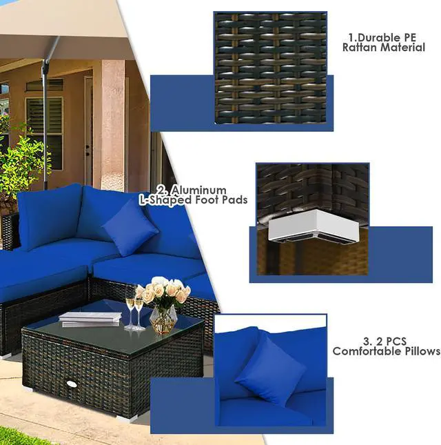 Are you waiting for a proper rattan chair set to spend the leisure time? Sturdy and solid steel frame with all weather PE rattan can keep stability and durability for long time use. Soft cushions will hold you comfortably and the cover of cushion can be removed with smooth zipper. There is enough space to provide enough sitting space for several people. You can also regard the coffee table as an ottoman by removing the tempered glass top for more sitting space. Featuring with 1 armless sofa, 2 corner sofas, 1 ottoman and 1 coffee table, this patio furniture set can be combined in various ways according to your different needs. Just sit on the sofas and enjoy the sunshine in front of the pool or on the patio with your loved ones.