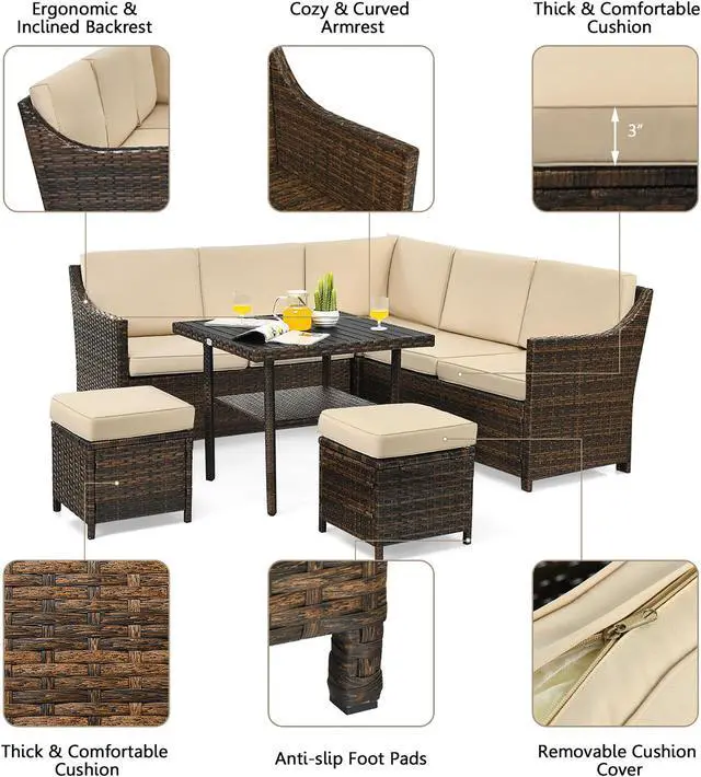 Our 6pcs rattan sofa set comes with 2 loveseats, 1 corner sofa, 1 dining table and 2 ottomans, which will create a super comfortable and spacious outdoor seating area for you and your family. Each piece of this sofa set can be used individually or in combination according to your needs. Made of a sturdy powder coated steel frame and all-weather PE wicker, this outdoor patio furniture set is sturdy and stable enough to support long-lasting use. Thick sponge padded cushions and soft fabric provide great comfort and skin-friendly touch. And equipped with a smooth zipper, the cushion cover is easy to remove and clean. What's more, the matching dining table with a lower storage shelf is perfect for holding drinks, food and snacks as you lounge in the sun.