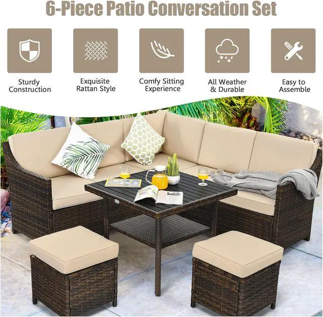 This 6-piece sectional rattan sofa set is perfect for any outdoor location, which brings both comfort and style!