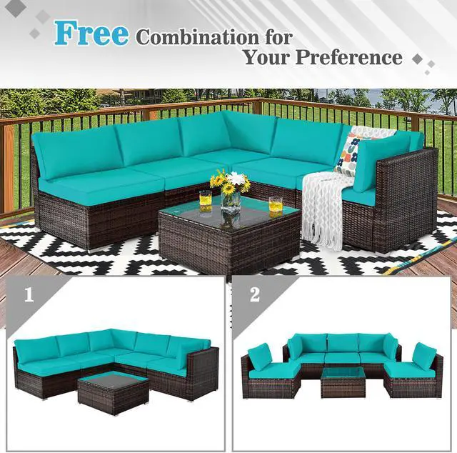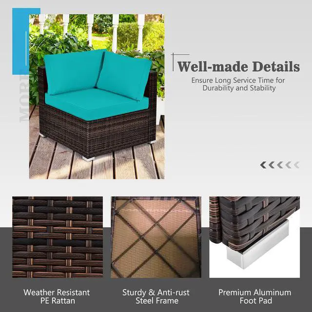 Our patio sofa set includes 2 armless sofas, 2 corner sofas and 1 coffee table. Each component of this set can be used individually or in combination, which allows you to combine them freely according to your needs. The sturdy steel frame and premium PE wicker ensure long-term service, and the maximum weight capacity of a single sofa is 400lbs. The foot pads can effectively prevent the floors from being scratched. In addition, the back and armrest are ergonomically designed, which can eliminate fatigue quickly. The thick cushions will make you feel comfortable and detachable covers are easy to clean. Stylish appearance can match well with any home decor and adds a sense of elegance to your home!