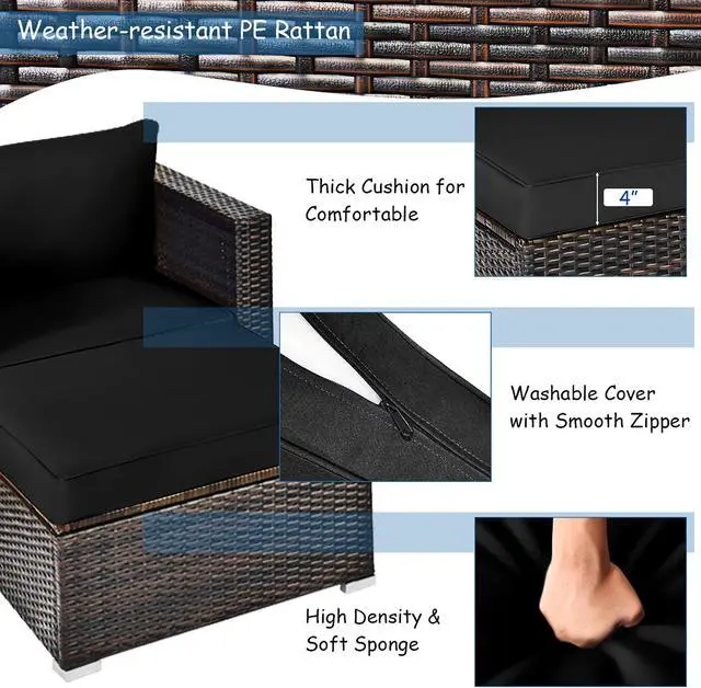 • Easy to Assemble & Dimensions: Coming with all the necessary parts and hardware, it is simple to assemble the rattan sofa set. Single sofa size: 33.5'' (L) x 29.5''(W) x 25.5''(H), corner sofa size: 29.5'' (L) x 29.5'' (W) x 25.5'' (H), armless sofa size: 29.5'' (L) x 25.5'' (W) x 25.5''(H), ottoman size: 29.5'' (L) x 29.5''(W) x 16.5''(H). Max weight capacity of each sofa: 360 lbs.