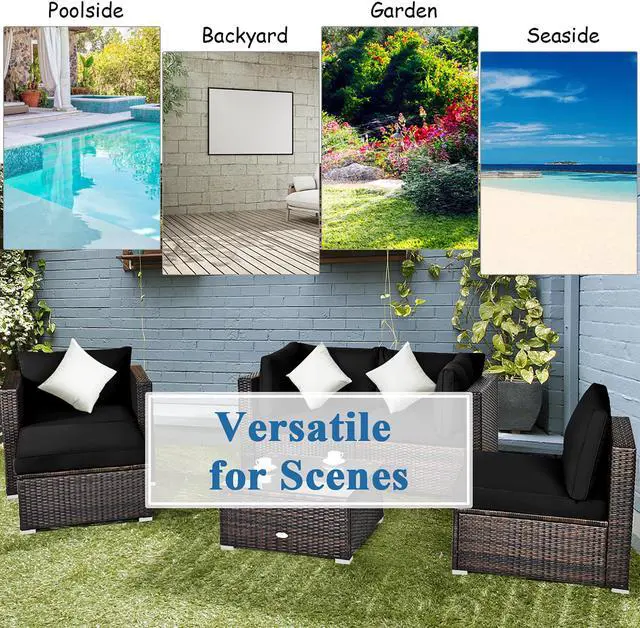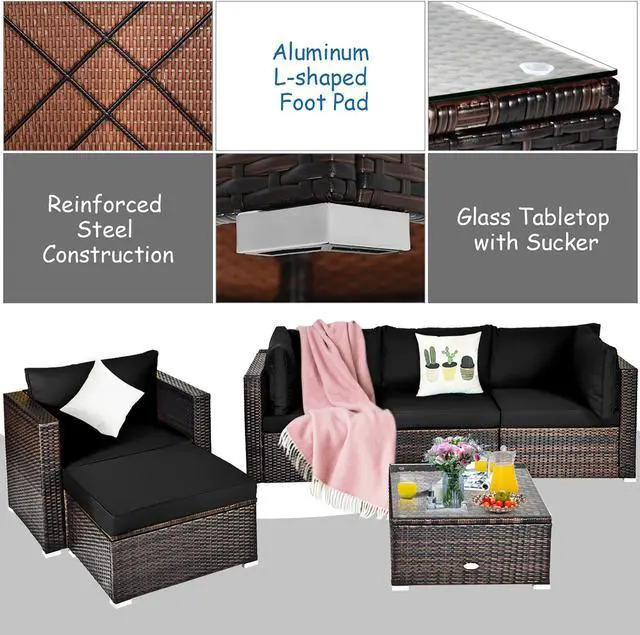 Costway 6PCS Patio Rattan Furniture Set Cushion Sofa Coffee Table Ottoman Black