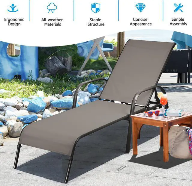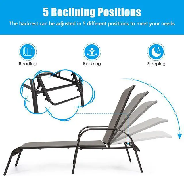 Are you in search of a chair that would allow you to take a nap on the balcony, backyard or garden? If so, then our patio chaise lounge is your perfect need. Its premium fabric and heavy-duty powder coated steel frame makes it sturdy for years of usage. Besides, breathable and skin-friendly surface is suitable for outdoor use and bring you a comfortable experience. And with the help of effective locking system, the backrest can be easily adjusted to 5 positions. Additionally, it features widened seat design, arc-shaped armrests. All in a quest to provide you comfort at unparalleled level. The lightweight design offers a great convenience in transporting it from one location to the other. As a result, our modern lounge chair is perfect for beach, poolside, yard or balcony. If you are looking for a recliner like this, do not miss it.
