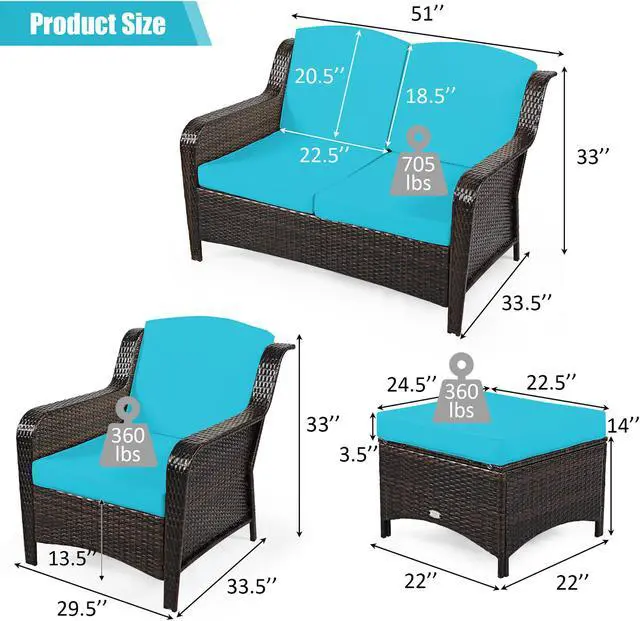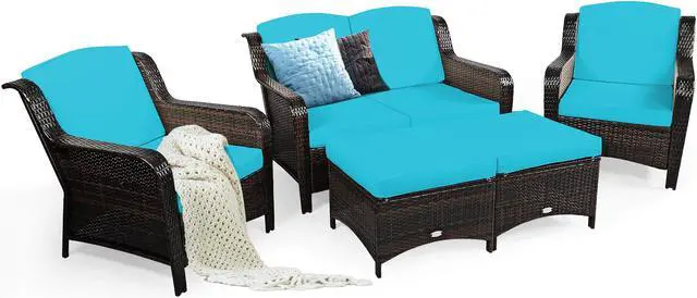This patio furniture set includes 2 single sofas, 1 loveseat and 2 ottomans, and you can combine them freely as you like! Our wicker set is made from premium PE rattan, which has excellent performance of water resistance and sun protection. The steel frame with non-slip pads ensures overall stability and safety. Ergonomically designed armrest and high resilience sponge cushion offer you optimal comfort even for a long time sitting. This rattan furniture set is suitable for your patio, lawn, porch, garden, backyard and poolside. More importantly, this rattan wicker set is easy to maintain and cushions with detachable covers can bring great convenience to replace and clean.