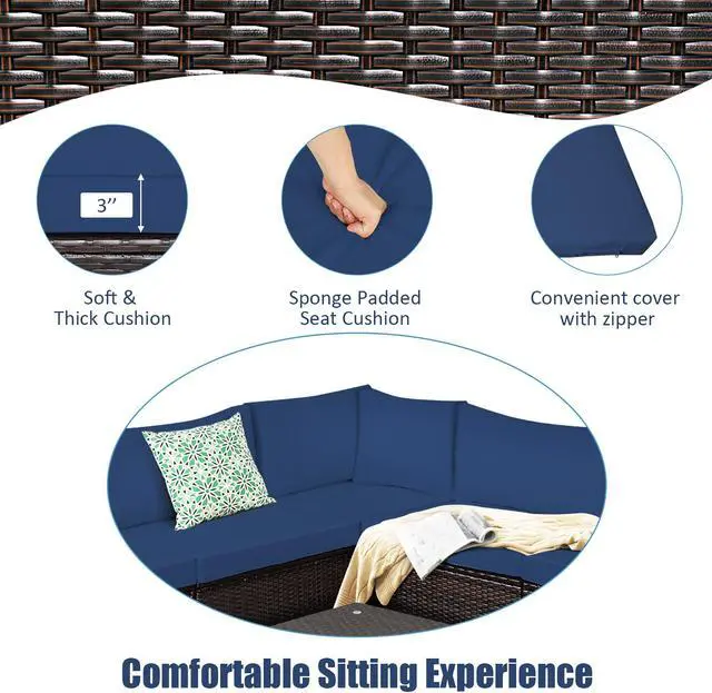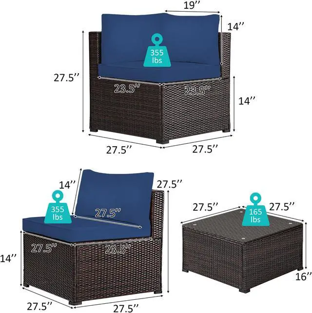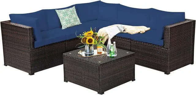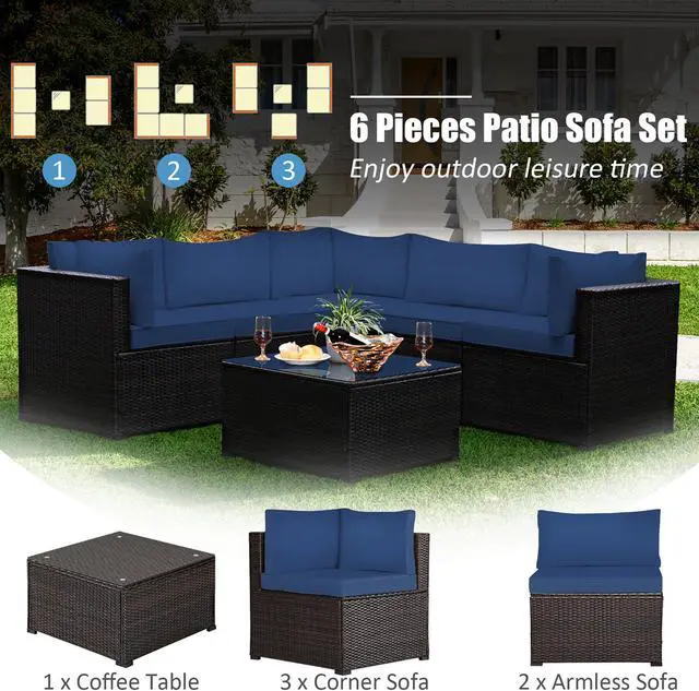 Our 6 pieces patio furniture set includes 3 corner sofas, 2 armless sofa, 1 coffee table. Powder-coated steel frame and weather-resistant PE rattan wicker offer sturdy and sturdy construction for long-term use. The thickened seat and resilient sponge padded cushions provide comfortable seating ex perience for you. Each component of this sofa set can be used individually or in combination based on your need. In addition, the tempered glass table is functional use and easy to clean. This rattan furniture set is suitable for your garden, balcony and poolside. You will find that this rattan set is your ideal choice!