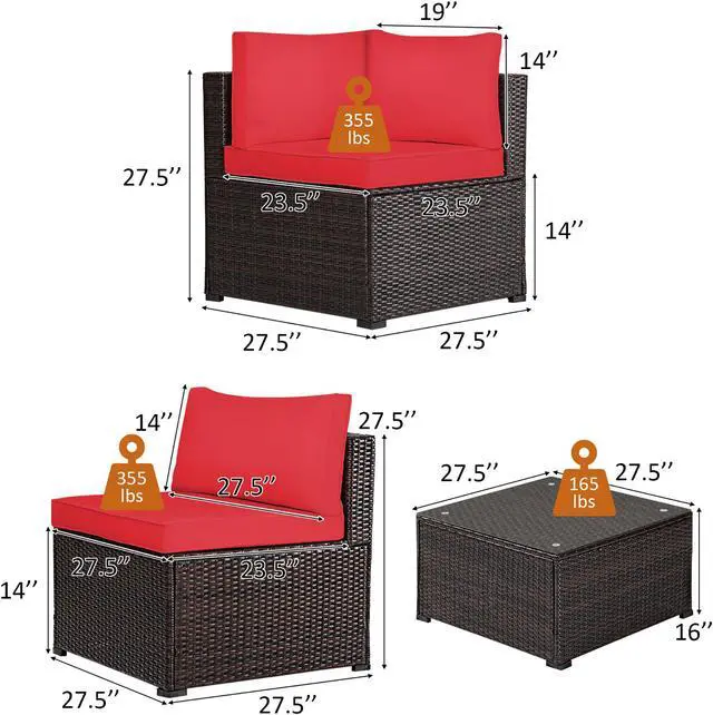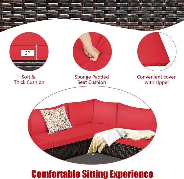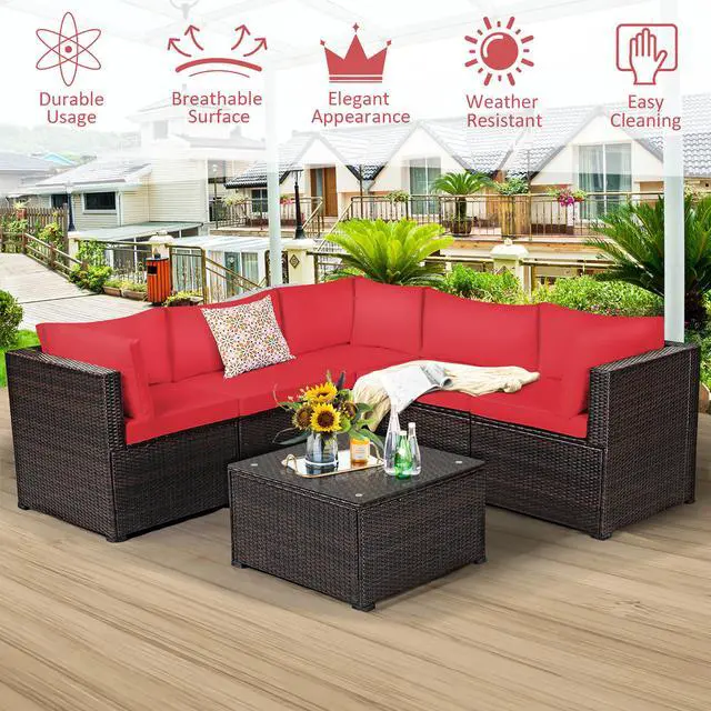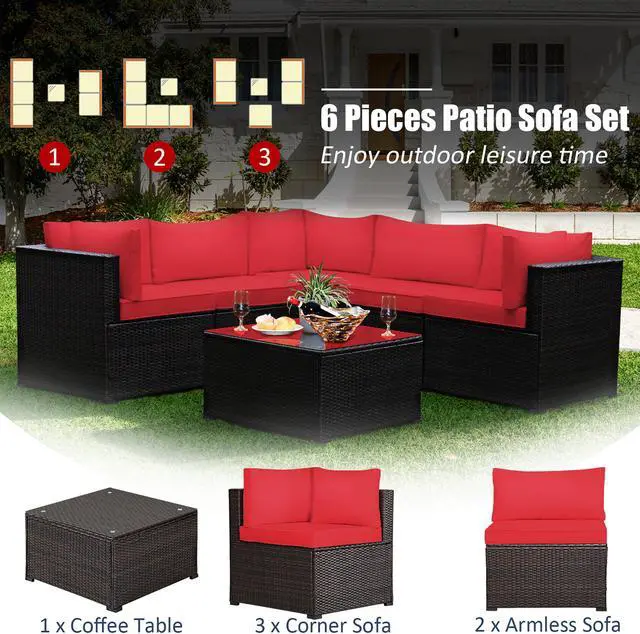 Our 6 pieces patio furniture set includes 3 corner sofas, 2 armless sofa, 1 coffee table. Powder-coated steel frame and weather-resistant PE rattan wicker offer sturdy and sturdy construction for long-term use. The thickened seat and resilient sponge padded cushions provide comfortable seating experience for you. Each component of this sofa set can be used individually or in combination based on your need. In addition, the tempered glass table is functional use and easy to clean. This rattan furniture set is suitable for your garden, balcony and poolside. You will find that this rattan set is your ideal choice!