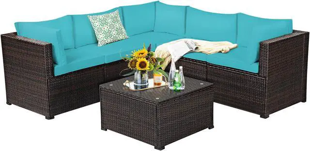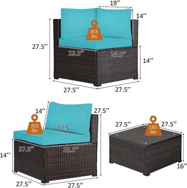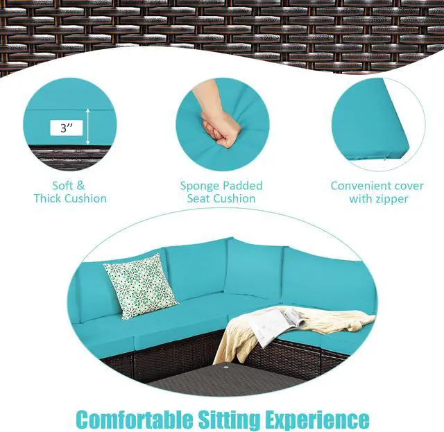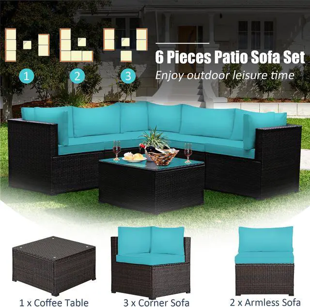 Our 6 pieces patio furniture set includes 3 corner sofas, 2 armless sofa, 1 coffee table. Powder-coated steel frame and weather-resistant PE rattan wicker offer sturdy and sturdy construction for long-term use. The thickened seat and resilient sponge padded cushions provide comfortable seating experience for you. Each component of this sofa set can be used individually or in combination based on your need. In addition, the tempered glass table is functional use and easy to clean. This rattan furniture set is suitable for your garden, balcony and poolside. You will find that this rattan set is your ideal choice!