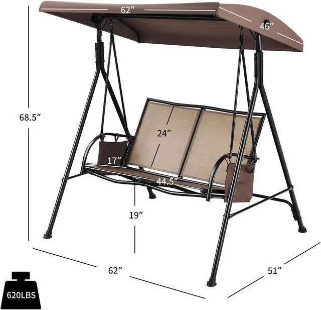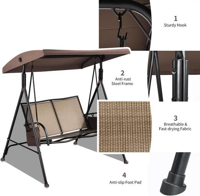 In order to make you comfortable sitting on it all day, this porch swing is specially designed with adjustable canopy, breathable fabric, large seat, curved backrest and ergonomic armrests. Whats more, stability is also important while swinging. Therefore, the heavy duty frame, sturdy hooks and non-slip foot pads form this stable swing glider. Additionally, this practical canopy swing fits outdoors because of its all-weather materials.