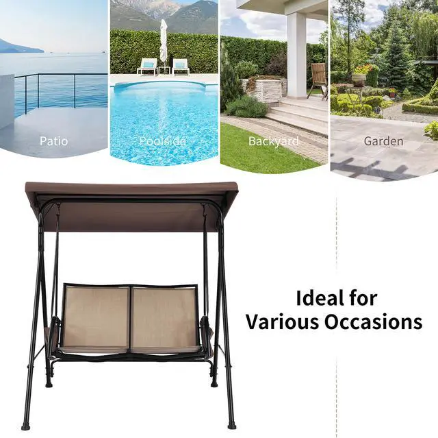 Places this swing chair outside with anti-rust frame and water-resistant canopy