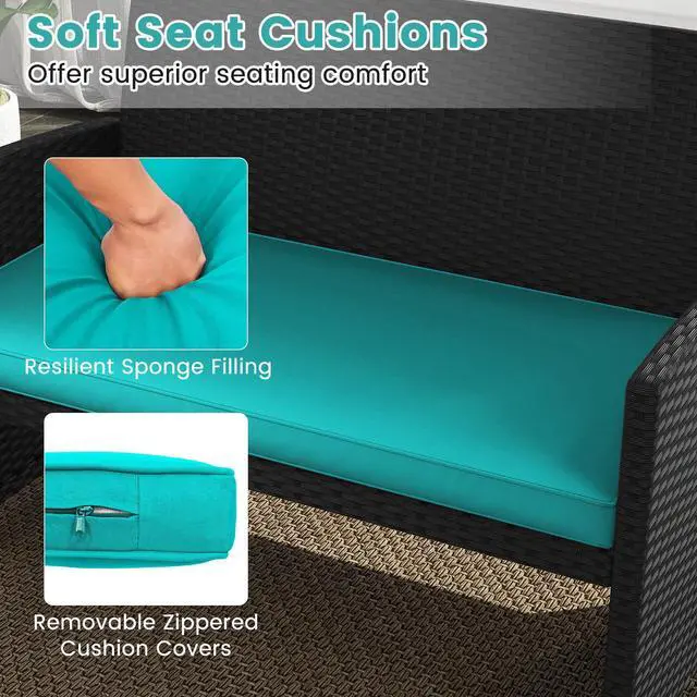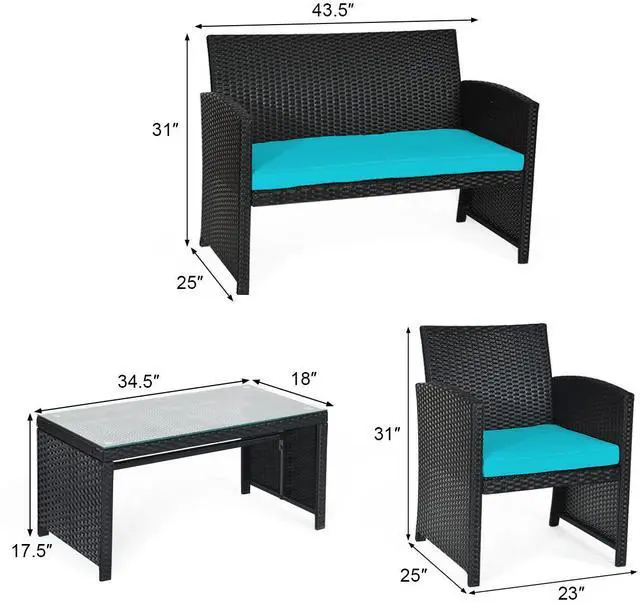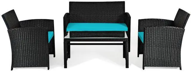 It's time to replace the outmoded outdoor furniture with our modern 4-piece patio wicker sofa and table set. Featuring with classic style and high-quality materials, our patio rattan set are ensured to last long. The softly cushioned wicker patio sofa set chairs are for maximum comfort and excellent seating experience. Powder-coated steel and anti- faded PE wicker provide sturdiness and durability to this patio furniture set. If the cushions get dirty by accident, you can simply zip off the cover and wash the covers. Besides, the coffee tabletop is made of tempered glass, so you can wipe it off with damp cloth. This set of rattan furniture can be placed in your courtyard, balcony and poolside for you to have a gathering or conversation with drinks and food. So make this furniture set yours and be sure to share the best of times with your dear ones.