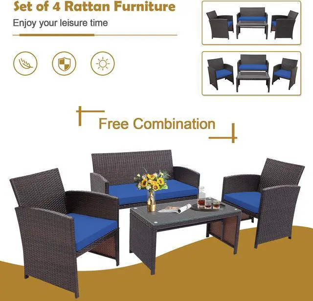 Our four-piece rattan sets brighten up your living space while providing a comfortable seat. Crafted with premium rattan, each piece creates a cool and textured appearance, which perfectly matches your outdoor or indoor space. In addition, rattan features the advantage of weather resistance to creating excellent user experience. The tempered glass coffee table comes with four suckers, which provide superior durability while bringing convenience. The high resilience foam seat adds softness dedicated to supporting and relaxing your hips. This outdoor furniture set includes 1 loveseat, 2 single chairs and 1 coffee table that can be freely combined based on your favorite.