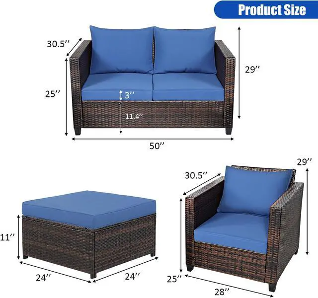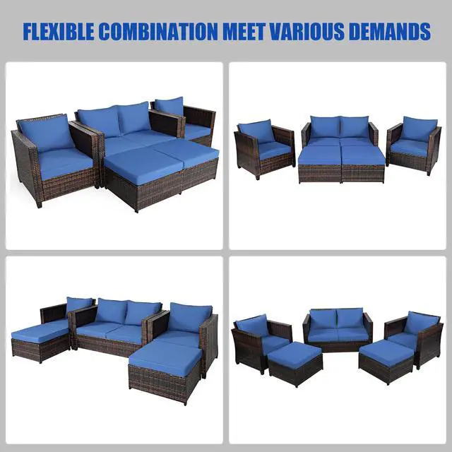 This 5-piece wicker patio furniture set includes 1 loveseat, 2 single sofas and 2 ottomans, which is a great choice for you to spend your leisure time. With ample space, you can use this patio furniture set in family gatherings or business conversations. This multifunctional patio furniture set is suitable for the balcony, deck, backyard, porch and poolside with its various styles. Crafted with a sturdy steel frame and wrapped in weather-resistant rattan, each sofa and ottoman is sturdy enough to provide long time service. 6 soft cushions and 4 pillows will give you a comfortable sitting experience. Plus, thick cushions with detachable covers can bring great convenience to replace and clean.