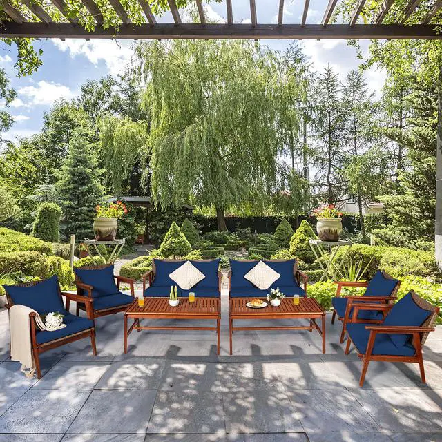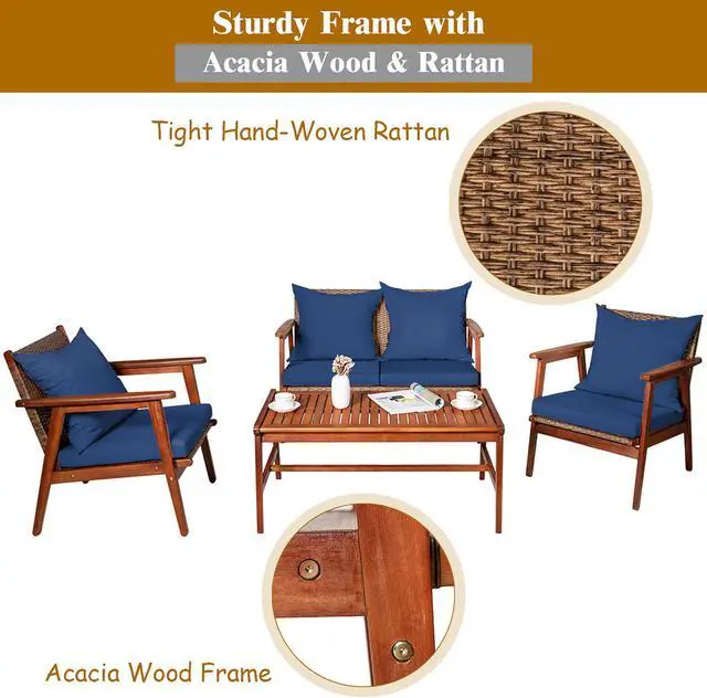 Do you want to have a private corner in your garden or patio? Our 4-piece furniture set is a good choice for you. The frame of set is made of premium solid wood and rattan, which ensures incredible durability and offers a beautifully textured look for long time. All the single chairs and loveseat are equipped with soft and high-resilient cushion for seat and backrest. You will get excellent comfort if you sit on the sofa. With hidden zipper, the covers of seat and back cushion are easy to be taken off and washed if it gets stained or dirty. And the set can be placed both in outdoor and indoor to be a good décor.