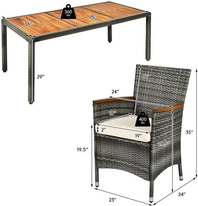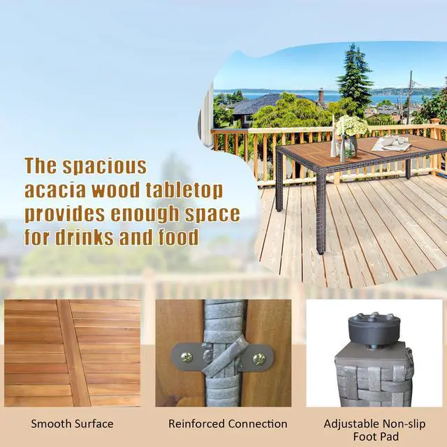 This practical rattan furniture set includes a large rectangular table and 8 chairs which offer spacious space to eat food and chat together. And the sturdy structure holds up to 360 lbs for table and 400 lbs for each chair. Besides, the solid acacia wood and weatherproof rattan ensures this outdoor furniture set can be used for a long time. Additionally, the waterproof cover with zipper can be easily removed, which facilitates your cleaning and maintenance. You can use this dining table and chairs set in different places, such as patio, garden, backyard and poolside, etc.