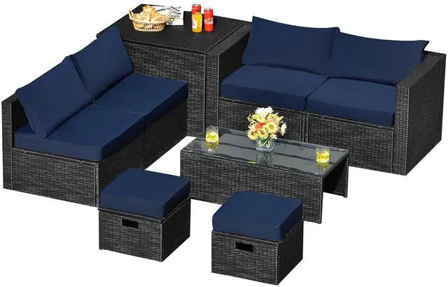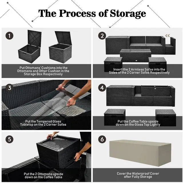 With 1 tempered glass coffee table, 1 storage box , 2 ottomans, 2 armless sofas and 2 corner sofas, this outdoor conversation set comes with various layouts for you to ex plore. Furthermore, the soft cushions and ergonomic backrests bring comfy sitting ex perience. After finishing the outdoor gathering, you can transform this patio sectional set into compact size, greatly saving your space. Moreover, the waterproof cover, all-weather PE rattan, anti-rust steel frame and non-slip foot pads endow the characteristics of durability and stability for outdoor use.