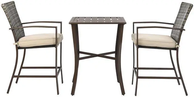 This outdoor patio furniture set is made of woven wicker and sturdy steel, making it sturdy, sturdy and weather resistant enough for long-lasting use. The ergonomic backrest and armrests give you increased support and unparalleled enjoyment when you lean on this breathable rattan chair. The removable cushion with thickened sponge padding provides you with extra comfort. Whats more, the square bar table with low maintenance lets you put wine, cups, snacks and decor for versatile use. You can put this elegant 3 pieces outdoor furniture set in the courtyard, garden and backyard.