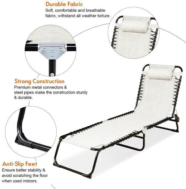 We have prepared this beach lounger for you. The ergonomic design relieves stress on your muscles. You can adjust the tilt of the backrest to suit your needs for relaxation. You can freely roll over on the recliner without worrying that the fabric will tear or the entire recliner will fall over. Because of its fabric and steel tube structure, it is extremely durable and strong. What are you waiting for? Don't hesitate to buy it. Enjoy life and release stress.