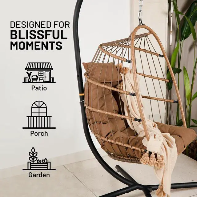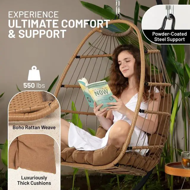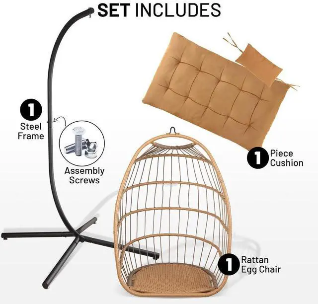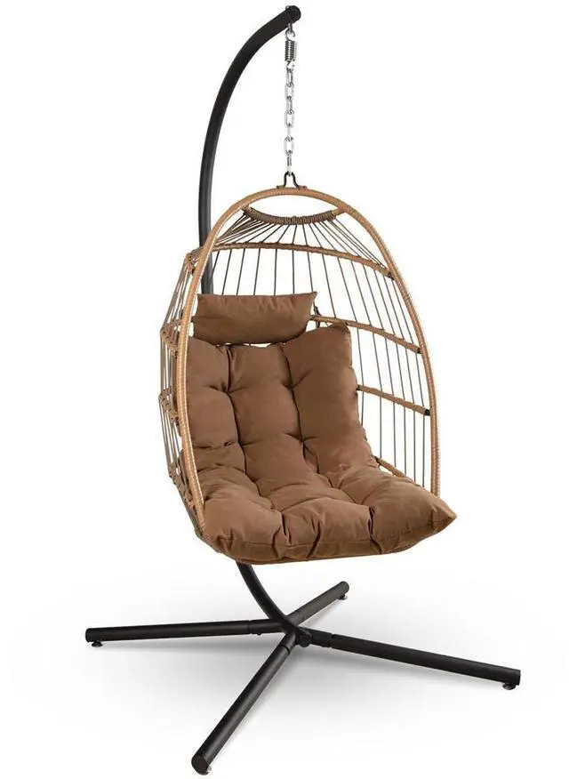 Relax in style with the SereneLife Foldable Egg Swing Chair. This freestanding, egg-shaped chair features a powder-coated steel frame and weather-resistant handwoven rattan wicker, making it both durable and stylish. The soft, breathable cushion with a headrest provides comfort for long hours of lounging. Its foldable design makes it easy to store, and the sturdy steel base ensures stability. Perfect for both indoor and outdoor use, this chair offers a cozy spot in your patio, porch, or bedroom. It also includes a hardware kit for easy assembly and maintenance.