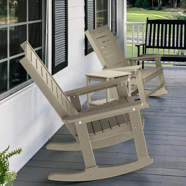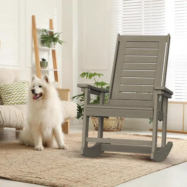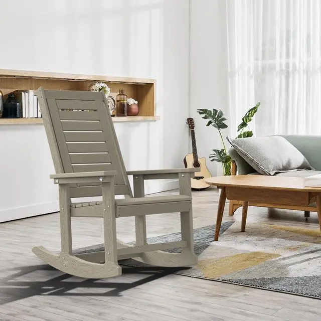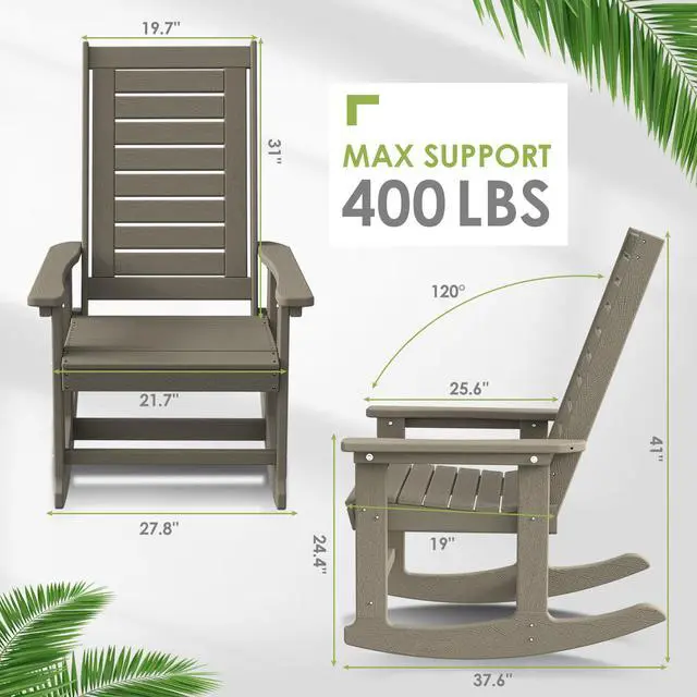 Ergonomic & Comfortable UPGRADED rocking chair is perfectly designed for indoors or out. Slatted high back & seating design sheds rainwater and dries quickly. 120°elevation allows you to have a wonderful rocking experience and effectively releases spinal pressure. 3.5-inch wide muscle armrests provide a spacious room for your favorite drinks or magazines! 2 solid rocking legs offer stable and smooth rocking. Trimmed edges keep you and your kids safe while enjoying the sunshine