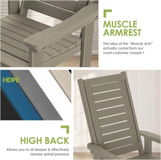 True HDPE Our upgraded composite material, the HDPE (High Density Polyethylene), gives a better quality and safer experience than typical material PE or PS. NEVER BREAK! Unlike the normal wood chair, HDPE Adirondack chairs are waterproof, weather-resistant, fade-resistant, and will not chip, peel crack, and rot as well, making it the perfect choice for outdoor use