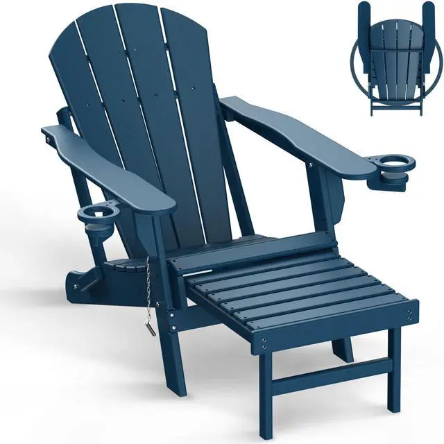 • Ergonomic & Foldable The Adirondack chair with ottoman is upgraded in 2023! Two perfectly hidden cup holders are added to both armrests, providing a spacious room for your favorite drinks or media devices. Retractable ottoman creates a perfect area to relax your legs. Reclined legs make the chair even more sturdy and stable. Slatted seating sheds rainwater and dries quickly. Trimmed edges keep you and your kids safe while enjoying the sunshine
