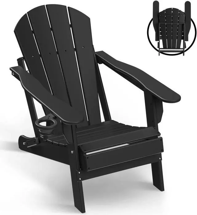 JiffyPoint Folding Adirondack Chairs, HDPE All-Weather Fire Pit Chairs with Cup Holder, Plastic Campfire Chair for Deck Backyard Patio Outdoor Poolside Porch Lawn, Black