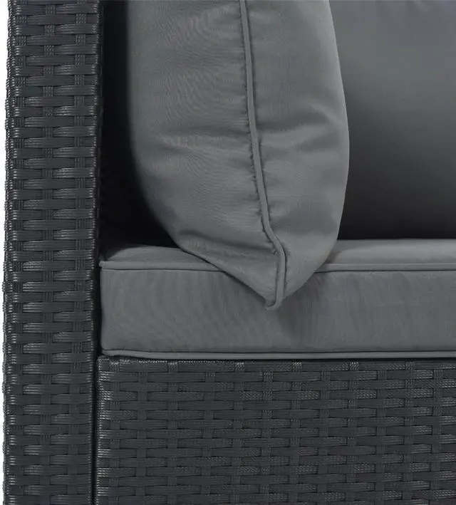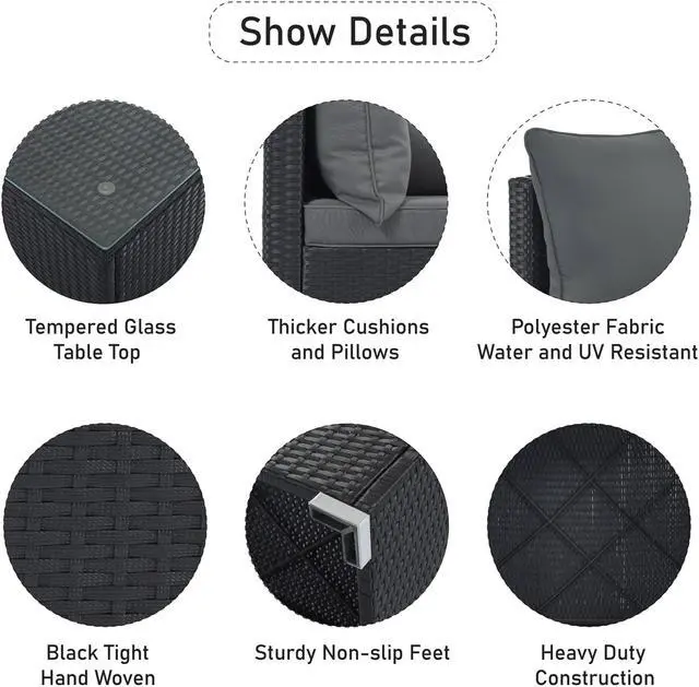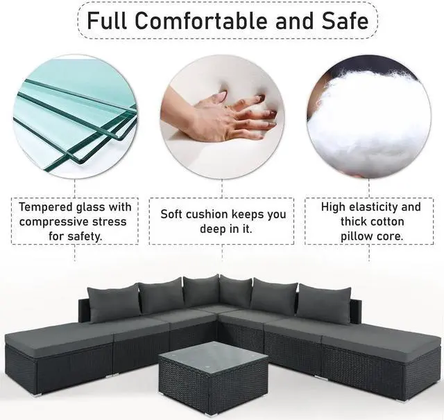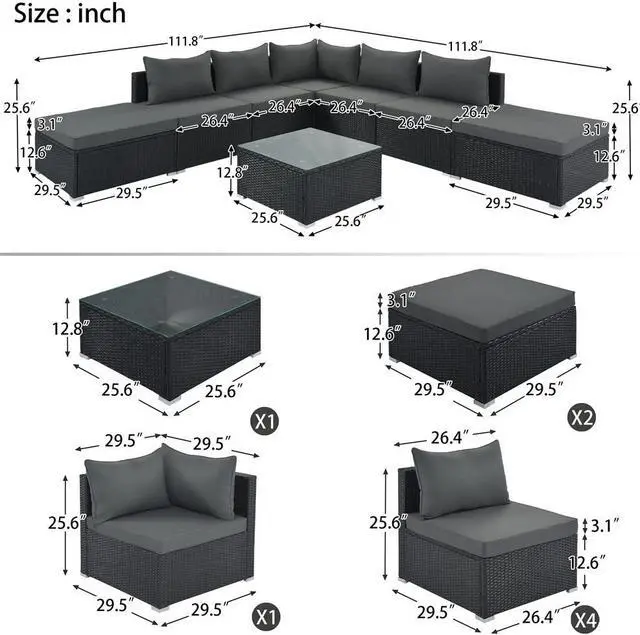 This wicker sofa set is made of sturdy iron frame and top quality wicker, including 1 corner sofa, 4 single sofa, 2 ottomans and 1 coffee table. Gray hand woven wicker with the comfortable look and texture of natural wicker, thicker cushions and pillows for your ultimate enjoyment, safe and tough tempered glass, they all have high UV resistance and water resistance for years of use.