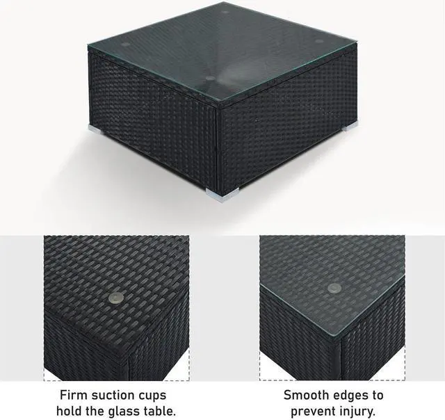 Those cushions are made of Polyester fabric that is waterproof, UV-proof and corrosion-proof for many years to use. The tempered glass is connected to the wicker table top through suction cups, which is very safe and stable. They only need a rag to keep them clean and tidy. While those pillows are equipped with zippers and only needs a simple cleaning.