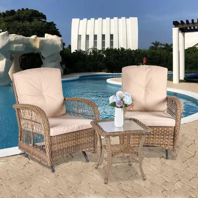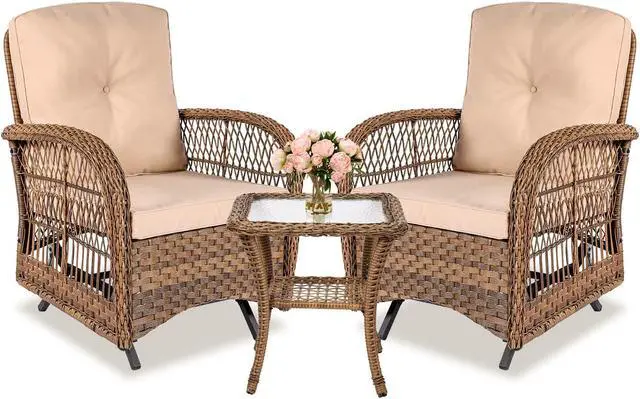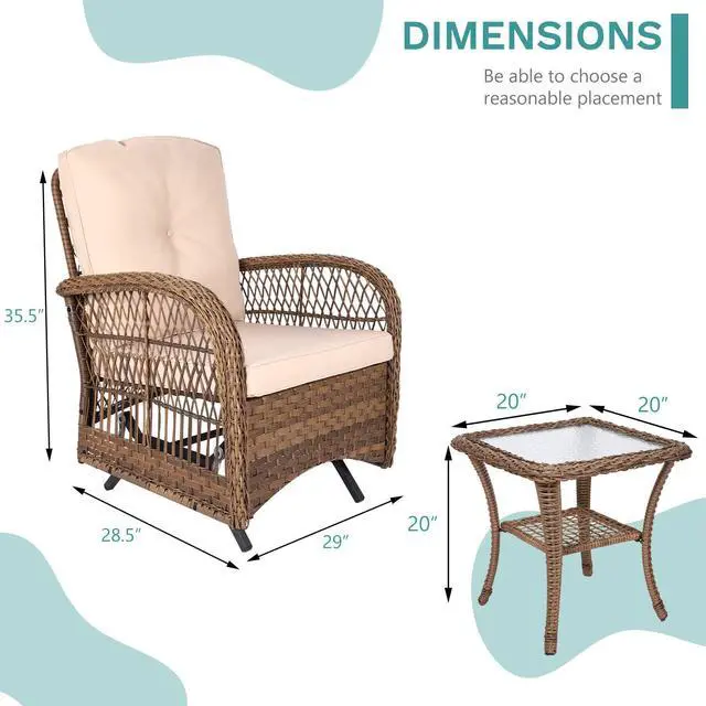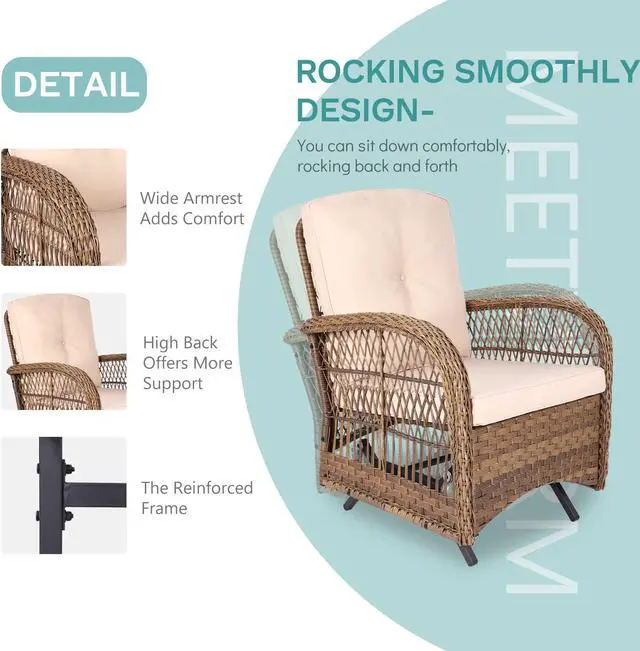 With concise and rustic design, these rattan patio rocking chairs feature neutral tones of brown and beige to compliment all existing furniture, home or outside colors, and add a touch of modern and elegance for your garden, backyard, porch or patio. It is a perfect place to relax yourself and enjoy leisure with a book in hand.