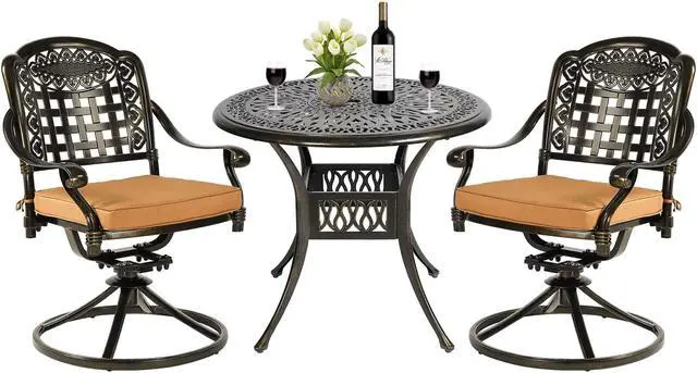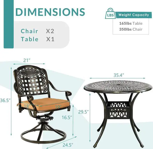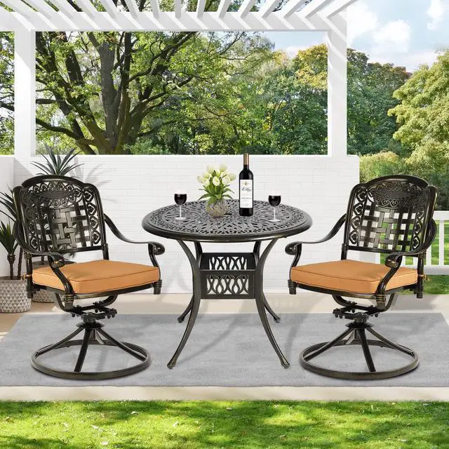 This MEETWARM patio Set includes 1 round table, 2 swivel chairs and 2 Cushions, meets all of your outdoor furniture needs, adding style to your space without sacrificing comfort. The chairs fit perfectly around the table for backyard family dining, picnics, or lounging poolside with friends, match any decor and suitable for outdoor and indoor use.