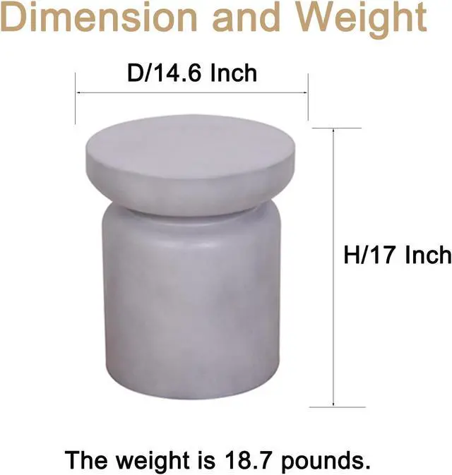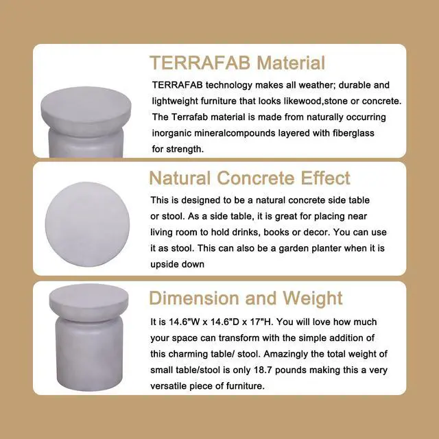 This side Table/ stool is mainly made of TerraFab in natural concrete effect. The case pack quantity is one and its weight is 25.3 lbs. The case pack and retail pack dimensions are 17.91 x 17.91 x 19.88 inches. The product is packaged open stock and is not in a PDQ. The product is intended for indoor/ outdoor use. Great for placing near living room seating to hold drinks, books or decor!