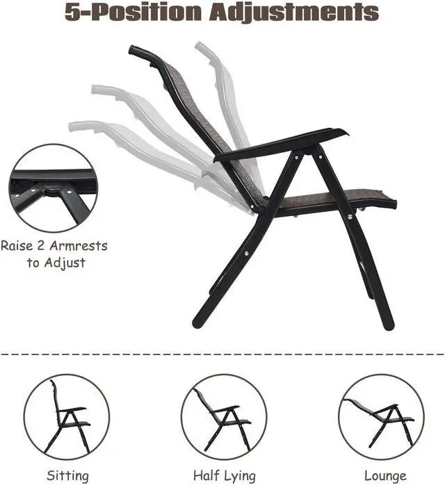 5-Level Adjustable Reclining: This outdoor chair has 5 adjustable backrest positions, allowing you to choose ideal positions from sitting up to reclining. Lifting the armrest and securing to the position which is most comfortable for your back, you can totally slow down and enjoy your leisure time.